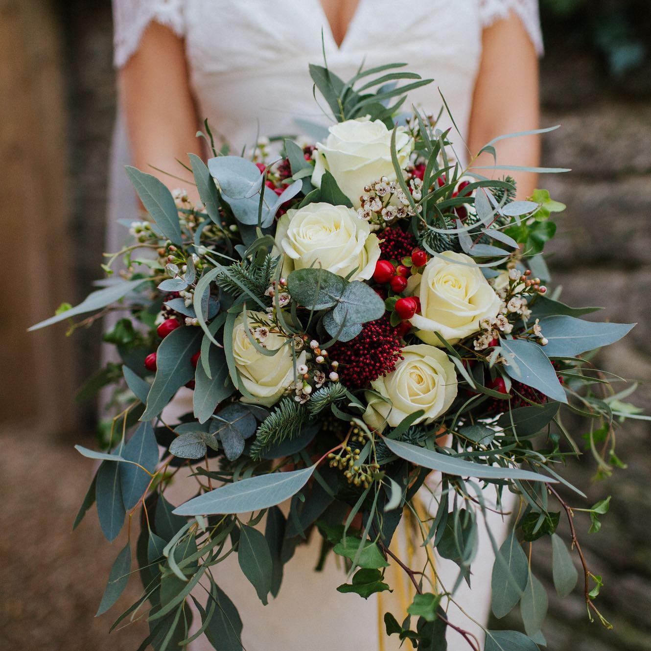 A stunning Christmas bouquet of white roses, assorted eucalyptus and ivy, with a touch of red hypericum, red rice flower, and glittered wax flower. A real holiday showstopper!